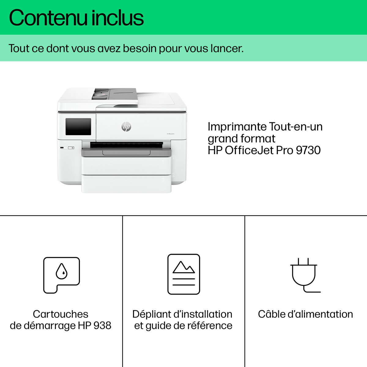 Encres fournies avec l’imprimante: Livré avec 1 HP 938 Cartouche d’encre de démarrage noire; 1 HP 938 cartouche d’encre de démarrage cyan; 1 HP 938 cartouche d’encre de démarrage magenta; 1 HP 938 cartouche d’encre de démarrage jaune